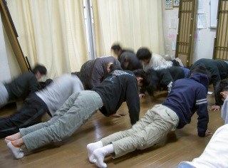 みんなで声を合わせて筋力トレーニングをします。
