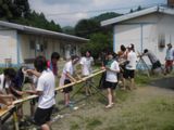 今回お世話になる大紀町役場のスタッフの皆さんにあいさつの後、春日井生Dさんの"誓いの言葉"から、平成18年の夏合宿は始まりました。 長田寮生と春日井生を合わせたチームは全部で6チーム。この内、2チームずつに別れて初日は それぞれが担当する仕事を行います。 |