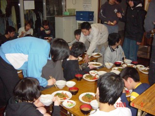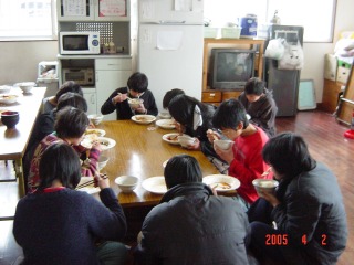 夜間の学校に通学している子供を除いた生徒全員で食事を食べます。 |